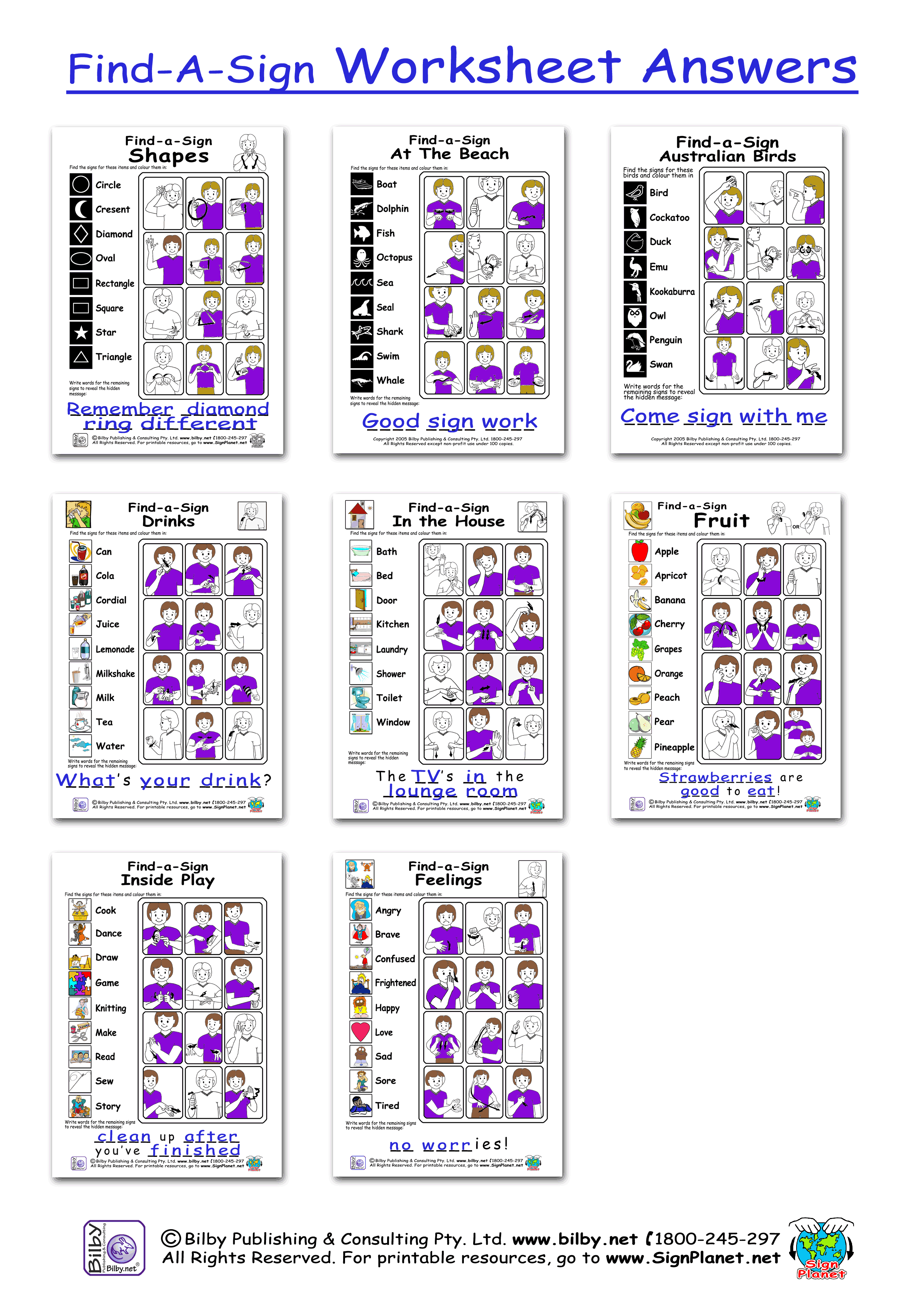 Answers to the Find-A-Sign series of worksheets. Coloured in and answer completed. Covers Fruit, Feelings, inside Play, In the House, Drinks, Australian Birds, At The Beach, Shapes